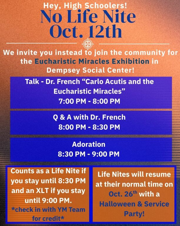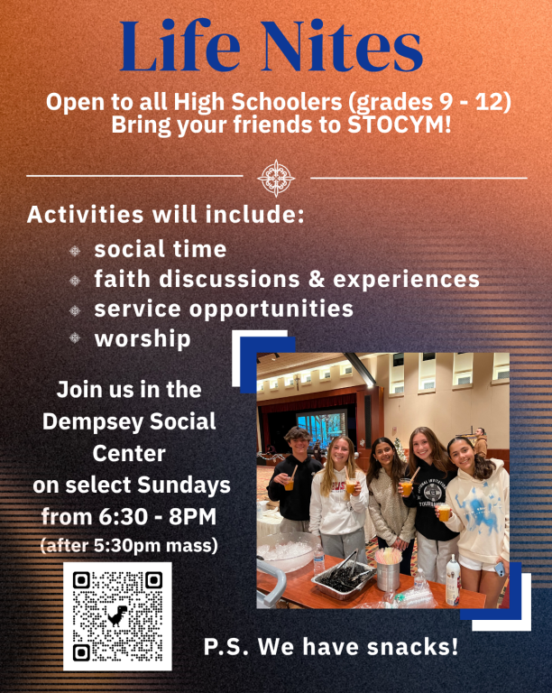Life Nites are opportunites for any and all youth who are of High School age (ages 14-17; grades 9-12), to come together in the context of joy and faith. These events are evenings of social time, planned activities, faith interaction, service opportunities, and snacks. They are a lot of fun, but also rooted in providing solid church teaching (utlizing elements of the Life Teen program) and authentic christian love that mirrors Christ.