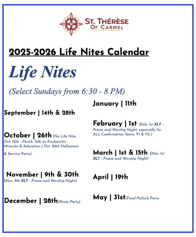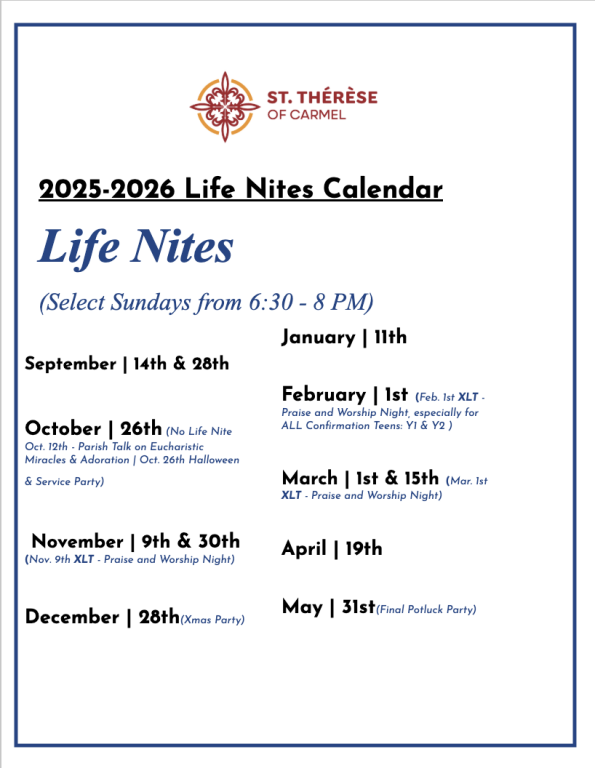 As a Eucharist-centered movement within the Roman Catholic Church, Life Teen leads teenagers and their families into a deeper relationship with Jesus Christ and His Church. With the Blessed Virgin Mary as our intercessor and guide, Life Teen seeks to unleash the fullness of the Sacramental power present within the young Church. At St. Thérèse of Carmel, our Life Teen program has given teens a place to form community and grow a deeper relationship with Christ.